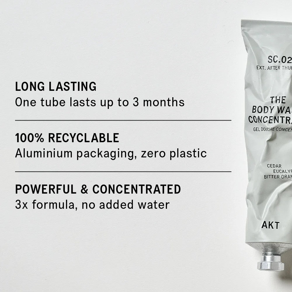 Pierce the seal with The Assistant (sold separately) or a pen. Squeeze a small amount of The Body Wash Concentrate in the palm of your hand or on The Konjac Sponge (sold separately). Activate it with water for a rich, abundant lather. Massage all over your body. Breathe in the fragrance. Rinse off. You’re on in five.