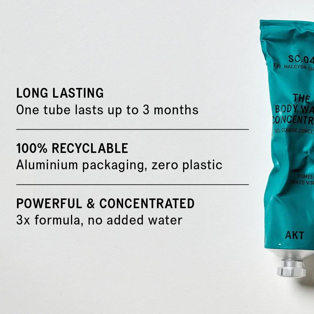 Pierce the seal with The Assistant (sold separately) or a pen. Squeeze a small amount of The Body Wash Concentrate in the palm of your hand or on The Konjac Sponge (sold separately). Activate it with water for a rich, abundant lather. Massage all over your body. Breathe in the fragrance. Rinse off. You’re on in five.